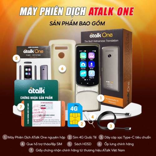 Máy dịch ATalk One là dòng máy dịch thuật thuộc thương hiệu ATalk Việt Nam. Đây là dòng máy phiên dịch đầu tiên mà ATalk sản xuất với giá thành cực kỳ rẻ nhưng vẫn tích hợp đầy đủ chức năng dịch thuật cốt lõi dành cho người dùng Việt. Đặc biệt, máy phiên dịch cầm tay ATalk One còn nổi bật với những tính năng dành riêng cho người dùng Việt Nam như:
