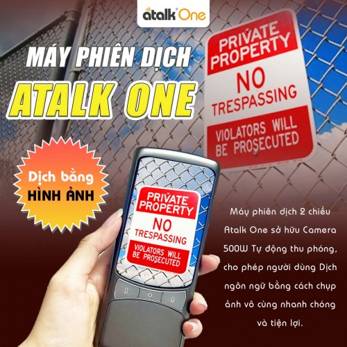 Chức năng Dịch Ảnh này được thực hiện thông qua Camera 500W Tự động thu phóng của máy hỗ trợ phiên dịch ATalk One. Người dùng chỉ cần chọn chức năng “Chụp ảnh”, bấm chụp, máy sẽ tự động scan, nhận diện văn bản chứa trong ảnh và dịch sang ngôn ngữ đã thiết lập. Nhấn vào biểu tượng “Loa” màu vàng/ xanh để nghe lại văn bản gốc và bản dịch.